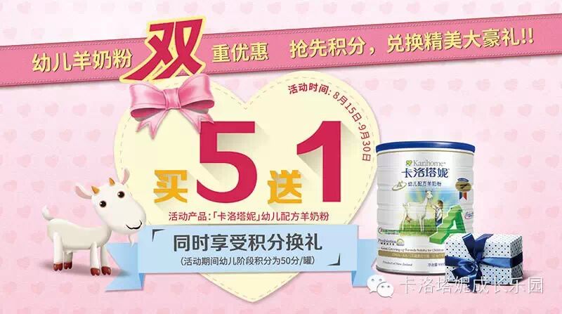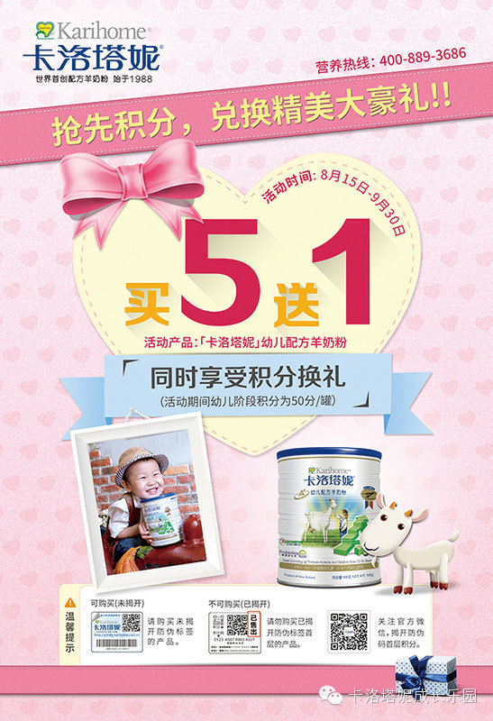 1、购买5罐卡洛塔妮幼儿配方羊奶粉并扫描二维码积分,可立即在购买店面获赠送同品1罐;